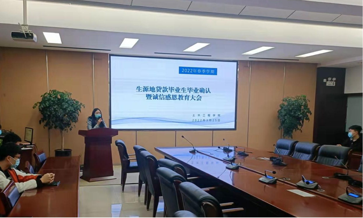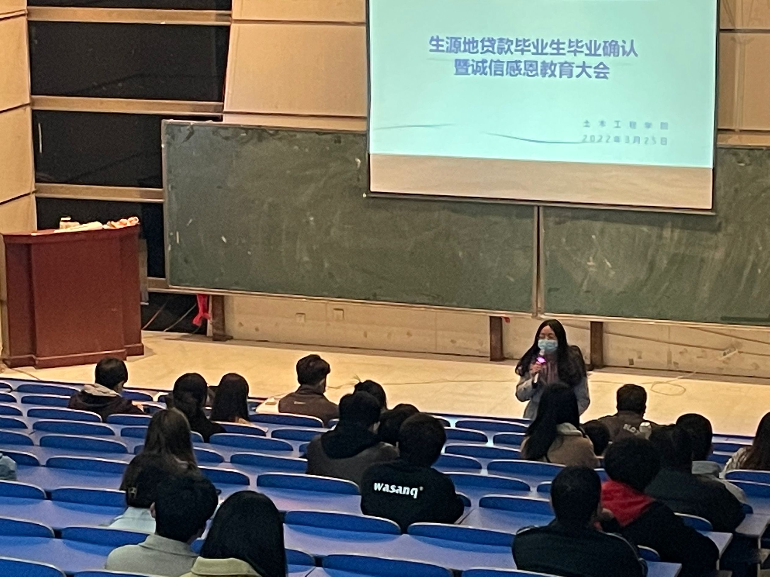 为顺利进行生源地贷款毕业生毕业确认、毕业还款工作,帮助毕业生树立诚信感恩观念,凤凰体育 于2022年3月25日晚在32208会议室和32201会议室召开2022年生源地贷款毕业生毕业确认暨诚信感恩教育大会。资助负责人李保云、资助助理及全体生源地贷款毕业生出席会议。为遵守疫情防控要求,会议分两个会场,全员佩戴口罩。
