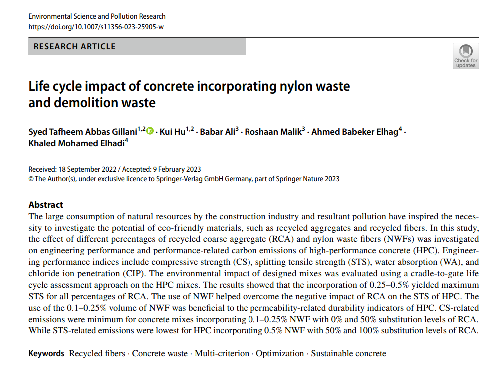 )2020级海外留学博士研究生Syed Tafheem Abbas Gillani在国际高水平学术期刊Environmental Science and Pollution Research(JCR Q2,IF=5.190)上发表了题为“Life cycle impact of concrete incorporating nylon waste and demolition waste”(DOI:10.1007/s11356-023-25905-w)的研究论文,该项成果为凤凰体育