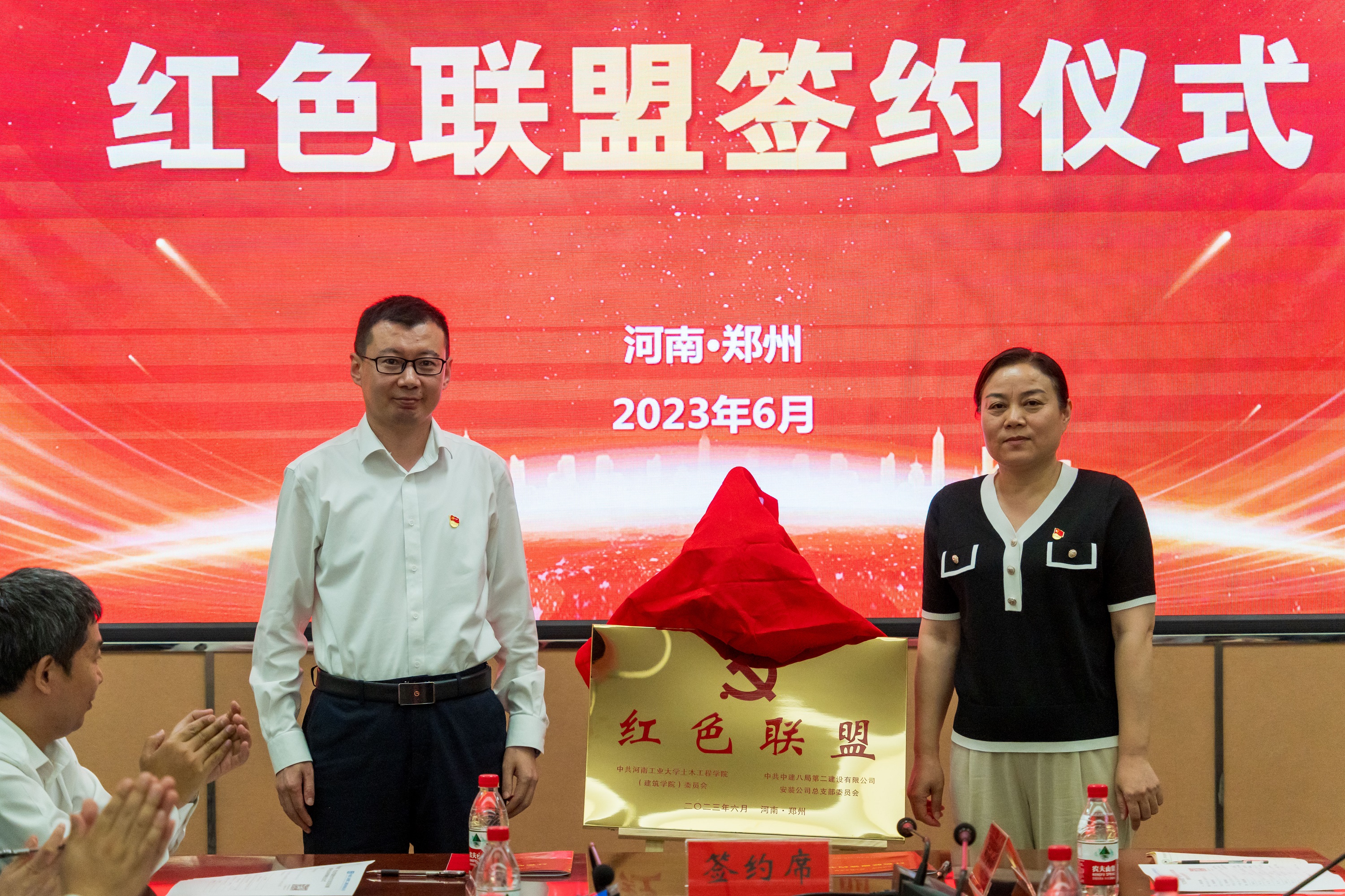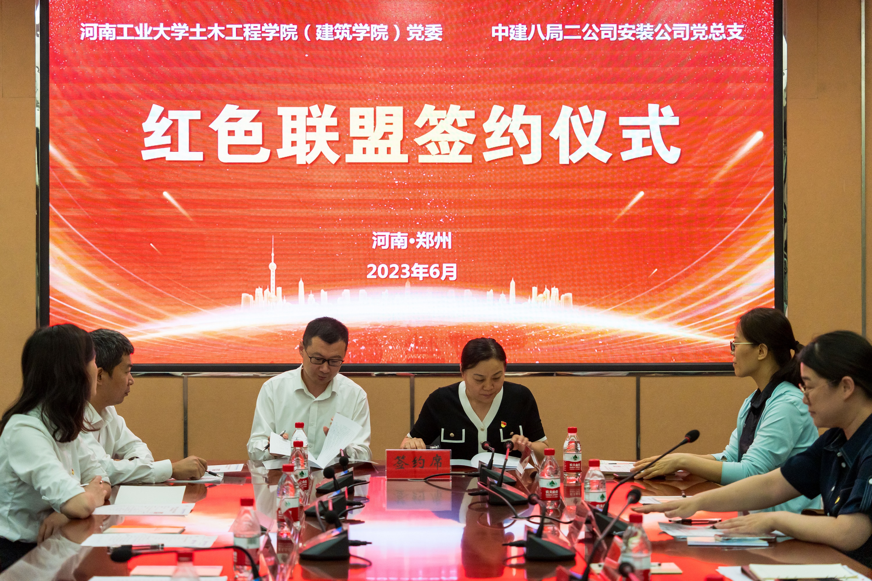 )与中建八局二公司安装公司在32208会议室举行校企党建联建活动暨“红色联盟”签约仪式。中建八局二公司安装公司工会主席、总会计师王东伟,公司中原区域负责人、党支部书记胡小波,中原片区党支部组织委员、校友代表王禹东等一行9人,来到凤凰体育
