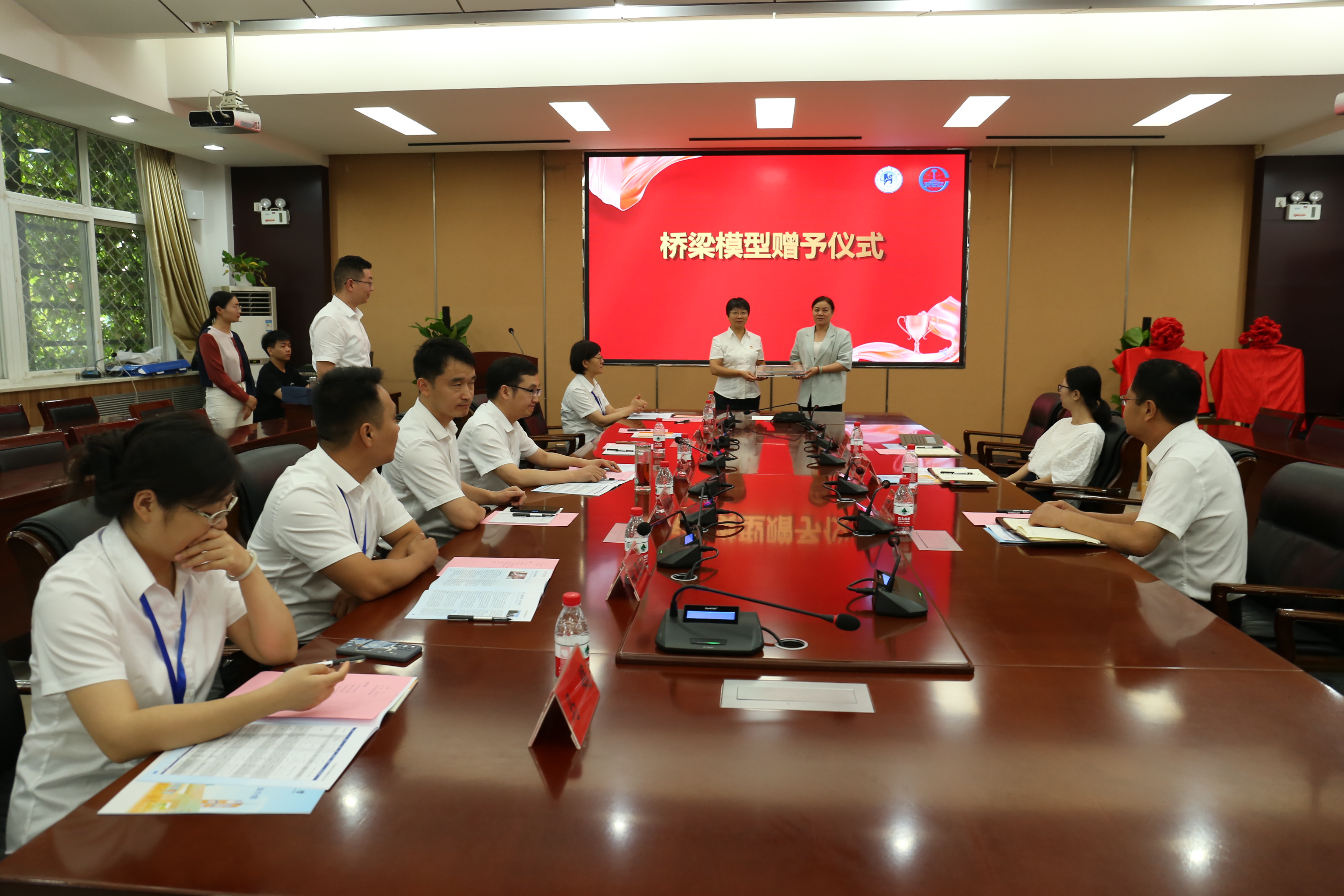 )赠予桥梁模型。丁永刚与付小鸽共同为“创新创业基地”和“就业实践基地”揭牌。