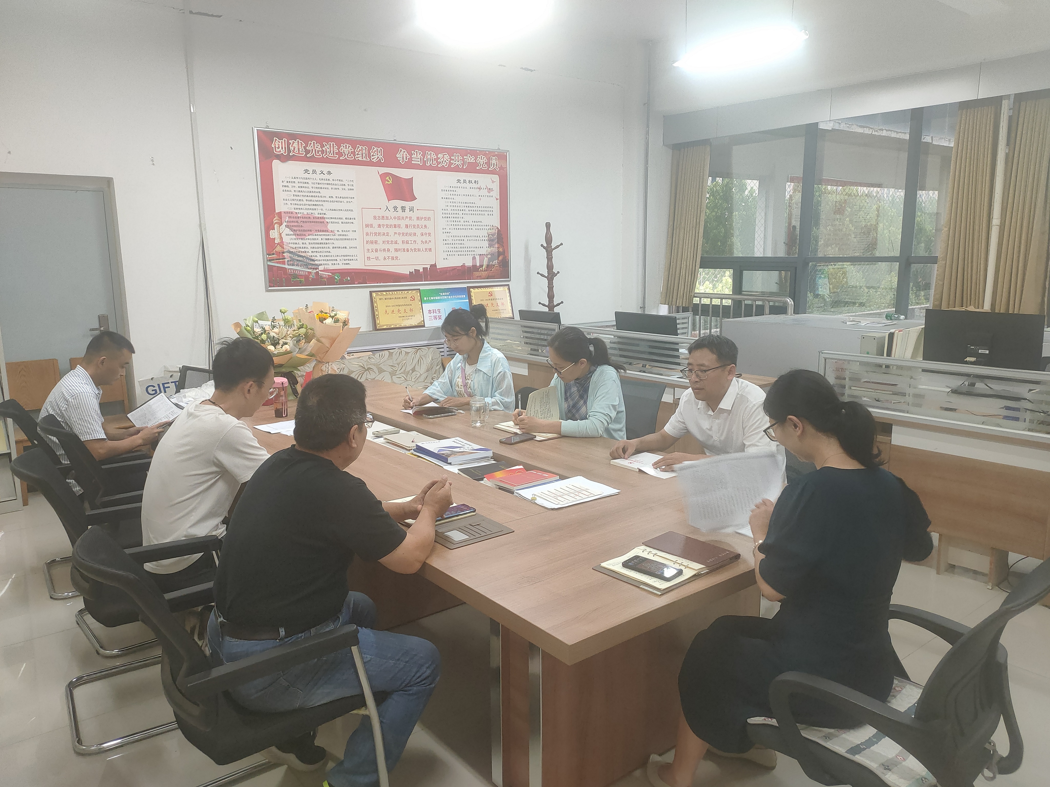 随后,王海霞领学《学习贯彻习近平新时代中国特色社会主义思想主题教育工作会议重要讲话》部分内容,毕文峰领学《中共中央关于在全党深入开展学习贯彻习近平新时代中国特色社会主义思想主题教育的意见》。支部各位党员同志紧扣主题,紧密联系个人思想和工作实际,深入查摆问题,明确努力方向,开展批评与自我批评。