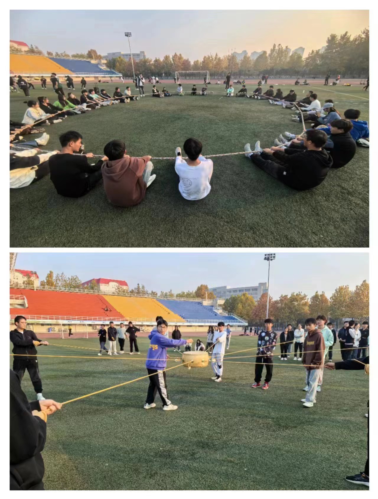 活动伊始,尹朝玉老师先以“拍手操”带领同学们开展了热身训练。随后,围绕着“破冰之旅——认识你我他”“组队环节——我与团队”“同心击鼓”“动力绳圈”等活动,带领同学们开展了生动而有趣的拓展训练。在和煦的阳光下,素质拓展活动现场充满了欢声笑语。大家踊跃尝试,沉浸在游戏的乐趣中。尹老师不断变换着指令,同学们积极参与、认真配合,按照教练的指示完成“滑稽搞笑”的动作,现场气氛一下子变得温馨热闹起来。各小组都充分发扬团结合作、互帮互助的优秀团队精神,充分彰显团队的凝聚力量,活动现场处处洋溢着青春活力。