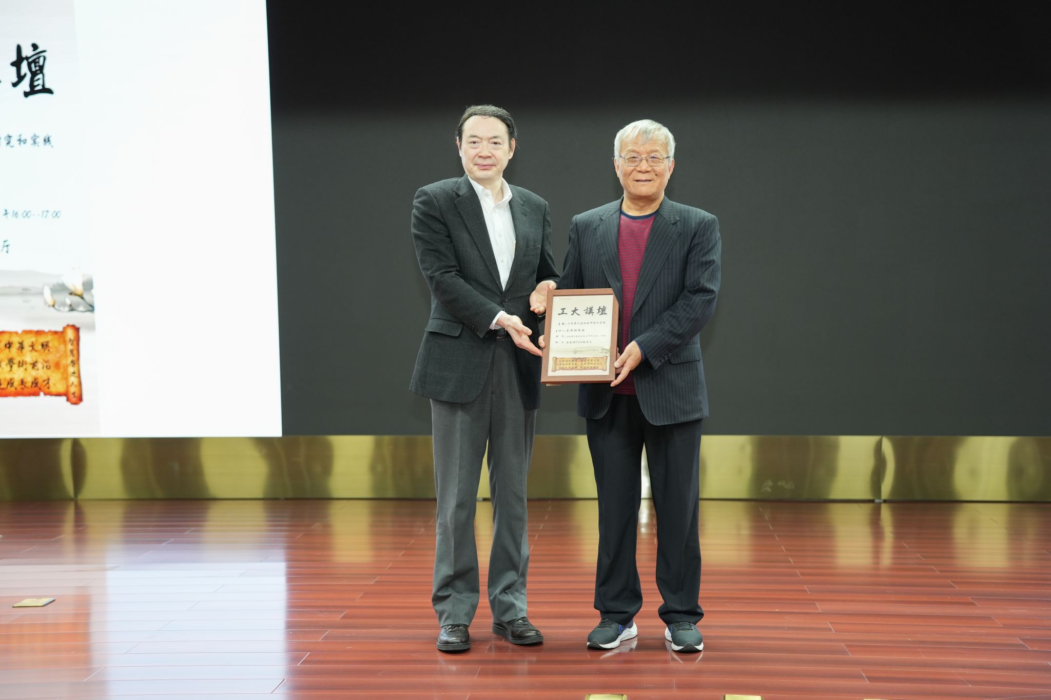 向两位院士赠送工大讲坛纪念海报,两位院士分别在“工大讲坛”纪念册上留下寄语,并与师生代表合影留念。