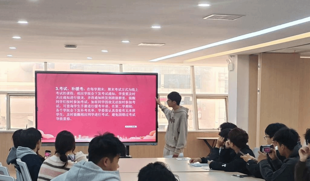 随后,学习部同学进行宣讲。着重强调教学通知在学生学习进程里的关键作用,详细介绍了教学通知所涵盖的大致内容。为进一步规范教学通知的传递流程,保障后续教学通知工作顺畅推进,学习部细致讲解了教学通知过程中的具体操作流程,力求让每一位学习委员明晰职责,确保教学通知能够及时、准确地传达给每一位同学。