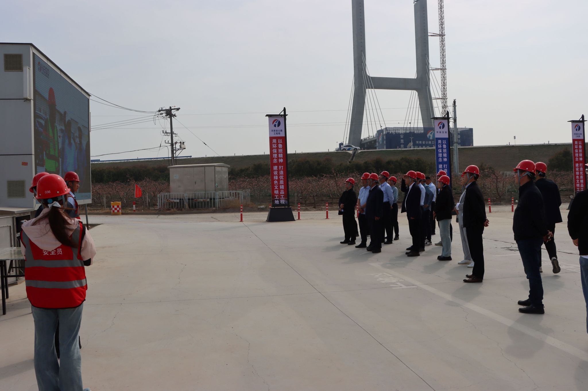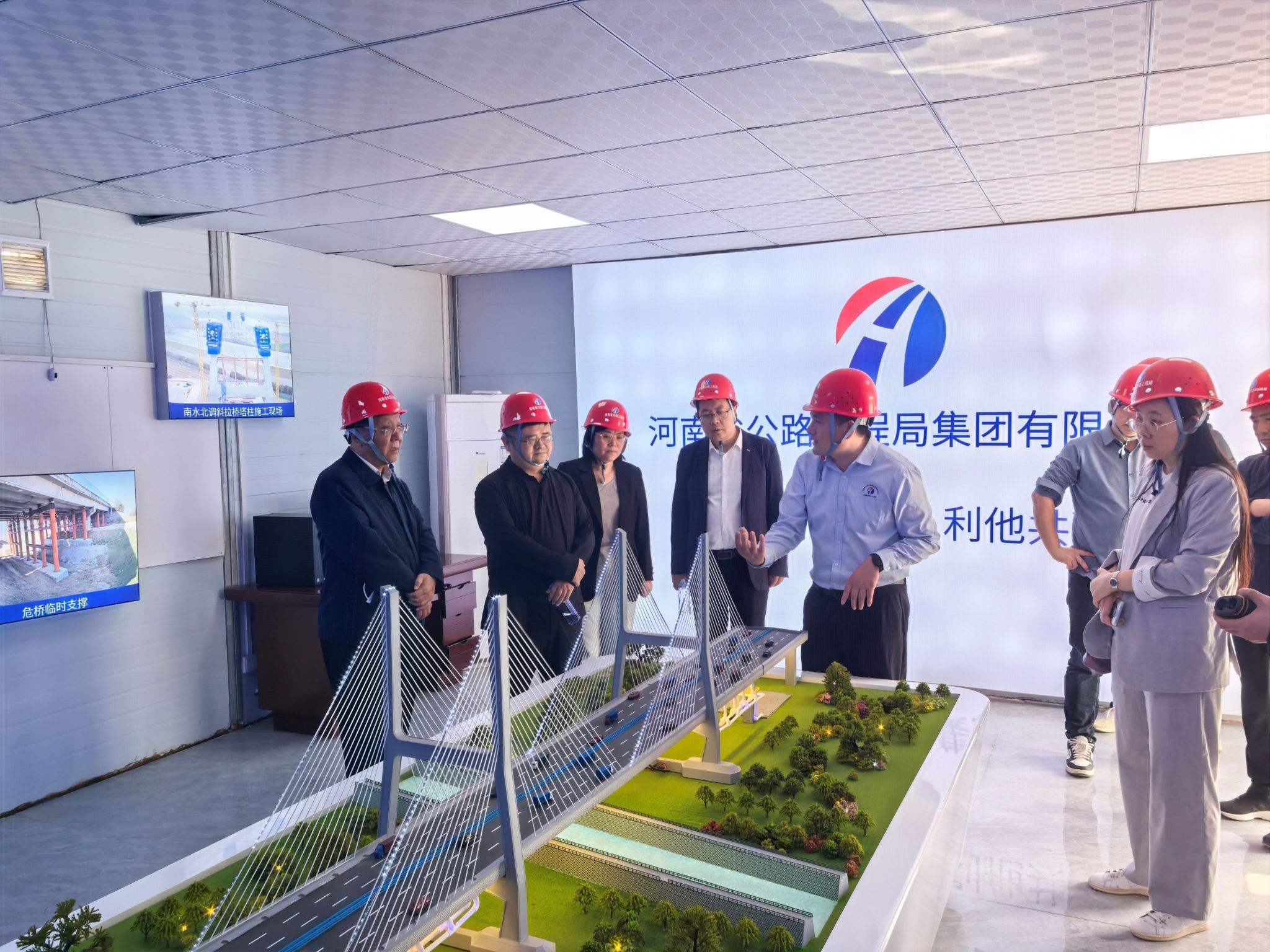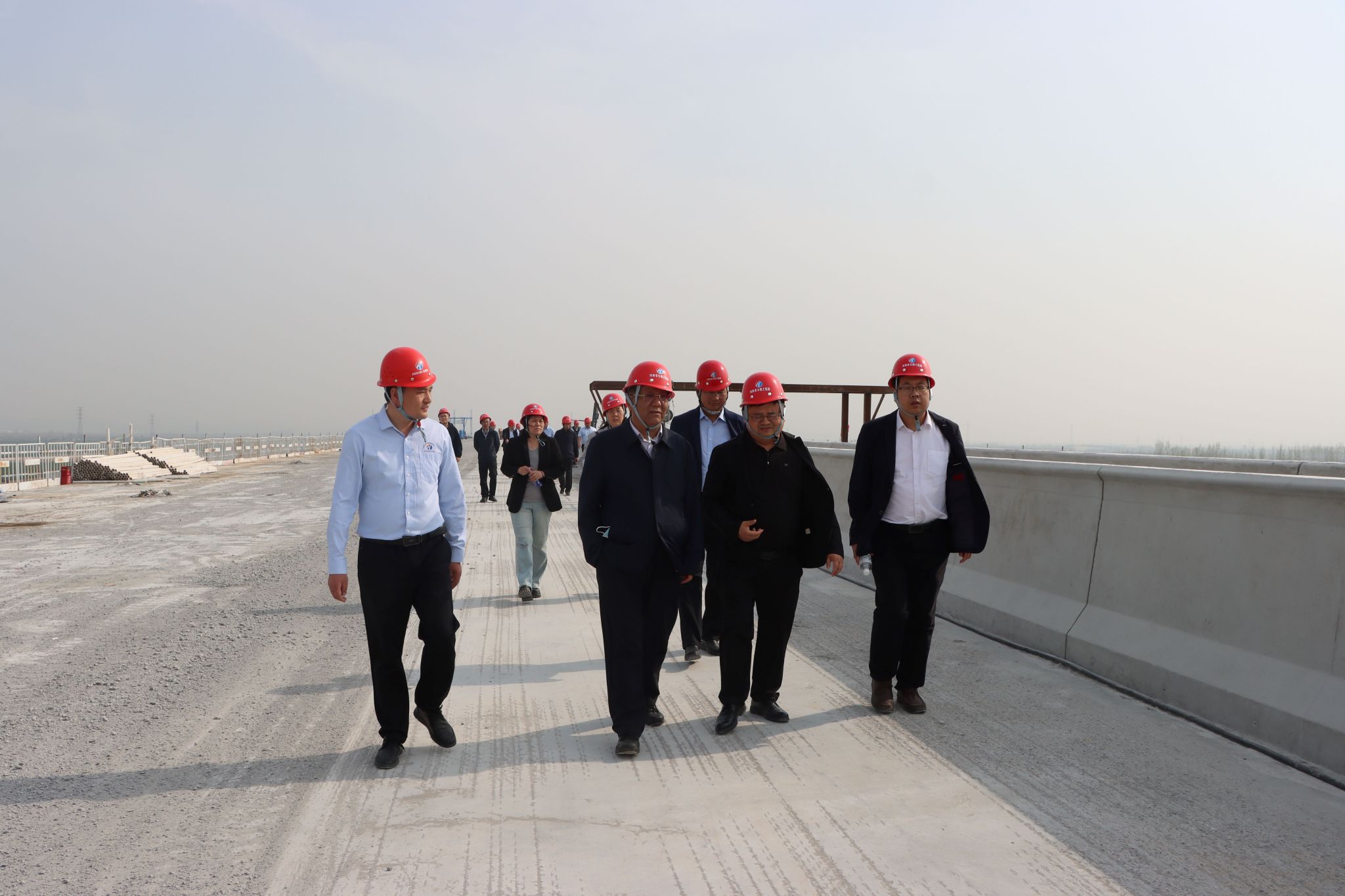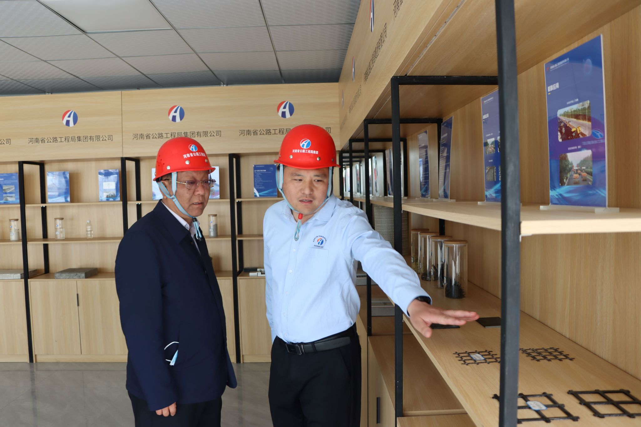 在集团董事长孙红宇、总经理靳俊中以及总工程师李传明的陪同下,张玉安一行先后实地调研了焦荥五标智能化钢箱梁顶推平台、焦荥高速智慧工地展览中心、南水北调斜拉桥施工现场等核心区域,涉及超高性能混凝土、玄武岩纤维等多个先进材料产业领域,深入了解企业发展、生产经营、科技研发和人才需求等情况。