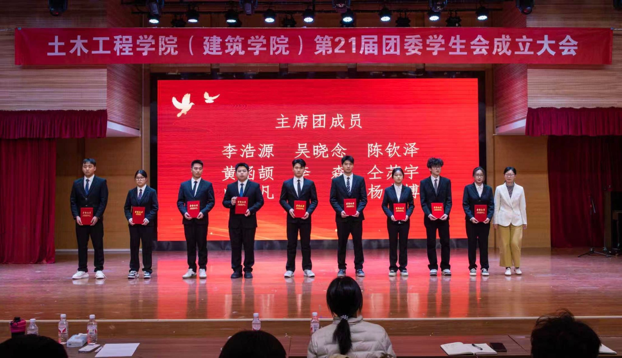党委副书记杨阳、团委书记闫静茹、全体辅导员及新一届团委学生会全体成员齐聚现场,共同见证这一重要时刻,会议由向柯主持。