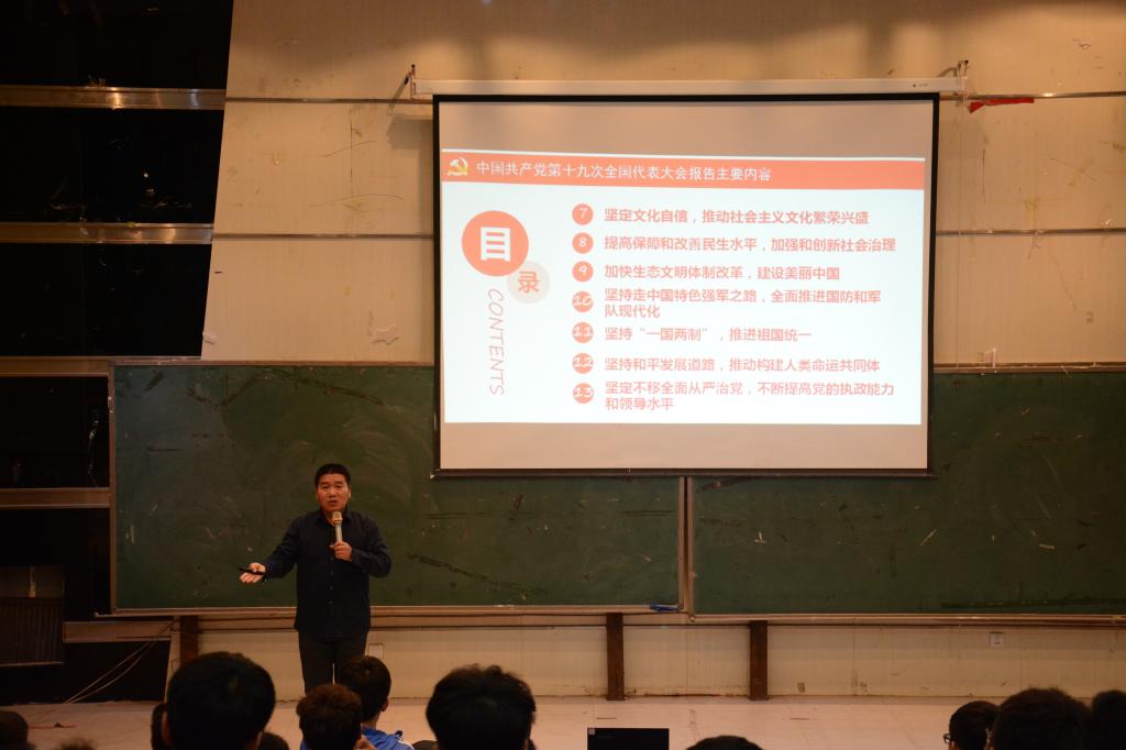 党课上,丁建波从党的十九大的历史地位、党的十九大报告的主要内容及如何学习宣传贯彻党的十九大精神等三个方面进行了详细讲解。他指出,党代表大会是党的一项根本组织制度,是党的各级组织讨论、决定党的重大问题和选举党的领导机关的会议,同学们不要将党代会与“两会”混淆。党的第十九次全国代表大会,是在全面建成小康社会决胜阶段、中国特色社会主义进入新时代的关键时期召开的一次十分重要的大会。党的十九届一中全会选举产生了新一届中央领导机构,选举习近平同志继续担任中央委员会总书记,体现了全党意志和全国各族人民的心愿。