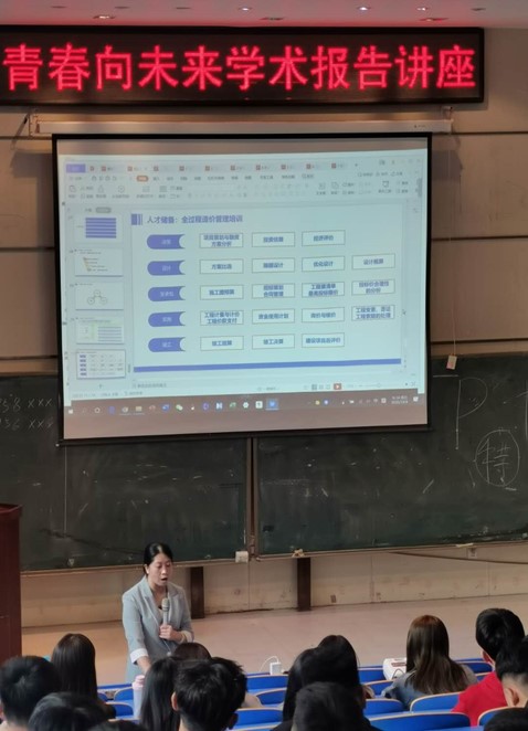 杨总以自己的成长经历为切入点,采用体验式分享的方式,为大家带来了一场工程管理大学生如何规划学习生活和职业生涯的饕餮盛宴。她以自己亲身的学习和工作案例,让学生们看到了一个普通学子的成长之路,更看到了榜样的力量,也让在场的老师和同学们记住了一位草根学子在艰难困苦中的坚持打拼、努力拼搏的身影,记住了一位以实际行动践行终身学习的优秀代表。